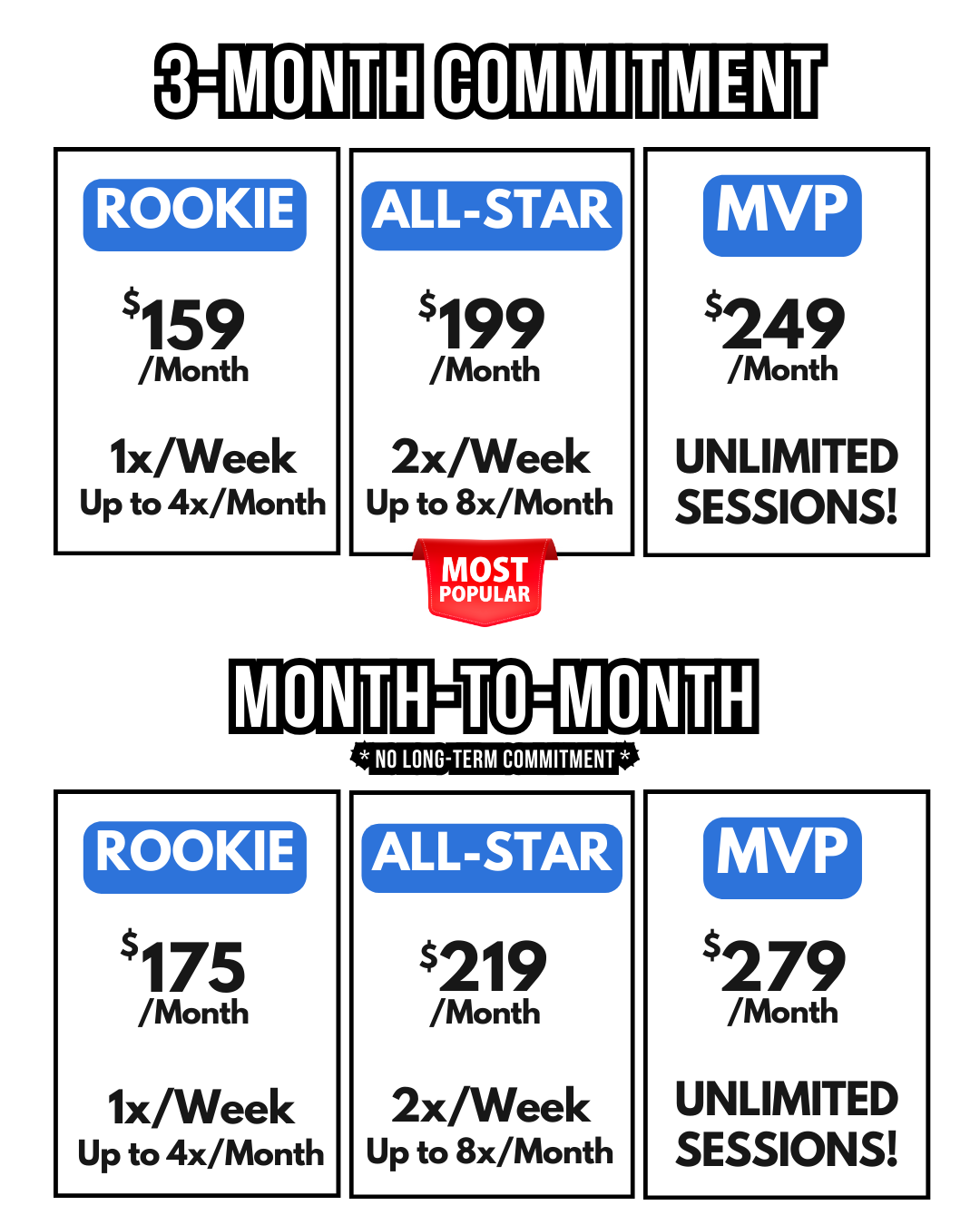 Training Quality is the SAME for All Memberships! Session Frequency Drives Development. Commitment Level Affects Pricing and Perks